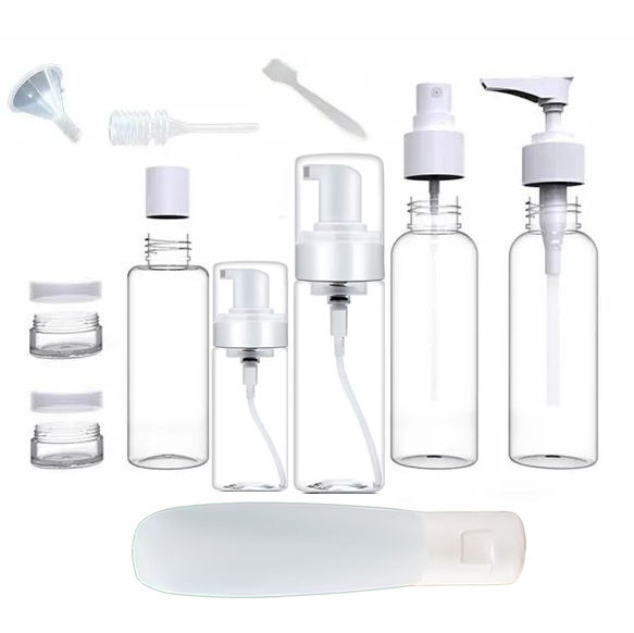 Tato praktická cestovní sada lahviček je ideálním řešením pro všechny, kdo si chtějí vzít své oblíbené kosmetické a hygienické produkty na cesty – bez zbytečně velkých balení. Sada obsahuje lahvičky, kelímky a doplňky různých velikostí a typů, které usnadňují dávkování a bezpečnou přepravu tekutin, krémů, šamponů nebo sprchových gelů.