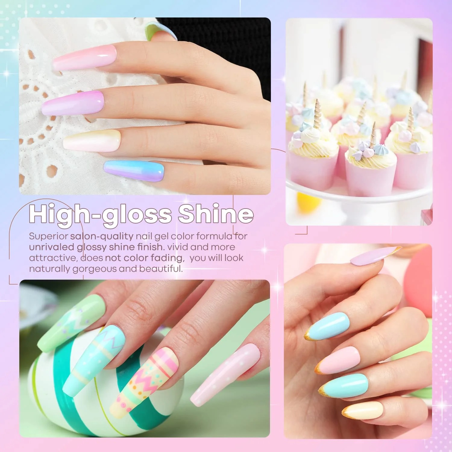 Každý odstín v této sadě je pečlivě vybrán tak, aby odpovídal nejnovějším módním trendům v manikúře. Pastelově modrá, růžová, levandulová, mátově zelená a vanilkovo žlutá dodají nehtům svěží, hravý a zároveň elegantní vzhled – ideální volba pro každou ženu, která miluje výjimečné barevné kombinace.
