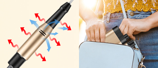Kompaktní a lehká konstrukce usnadňuje přenášení. Nehty si můžete upravovat kdykoli a kdekoli. Díky kompaktnímu provedení je můžete pohodlně uložit do kapsy nebo tašky. Díky vestavěné dobíjecí baterii nebudete mít problémy s kabely.