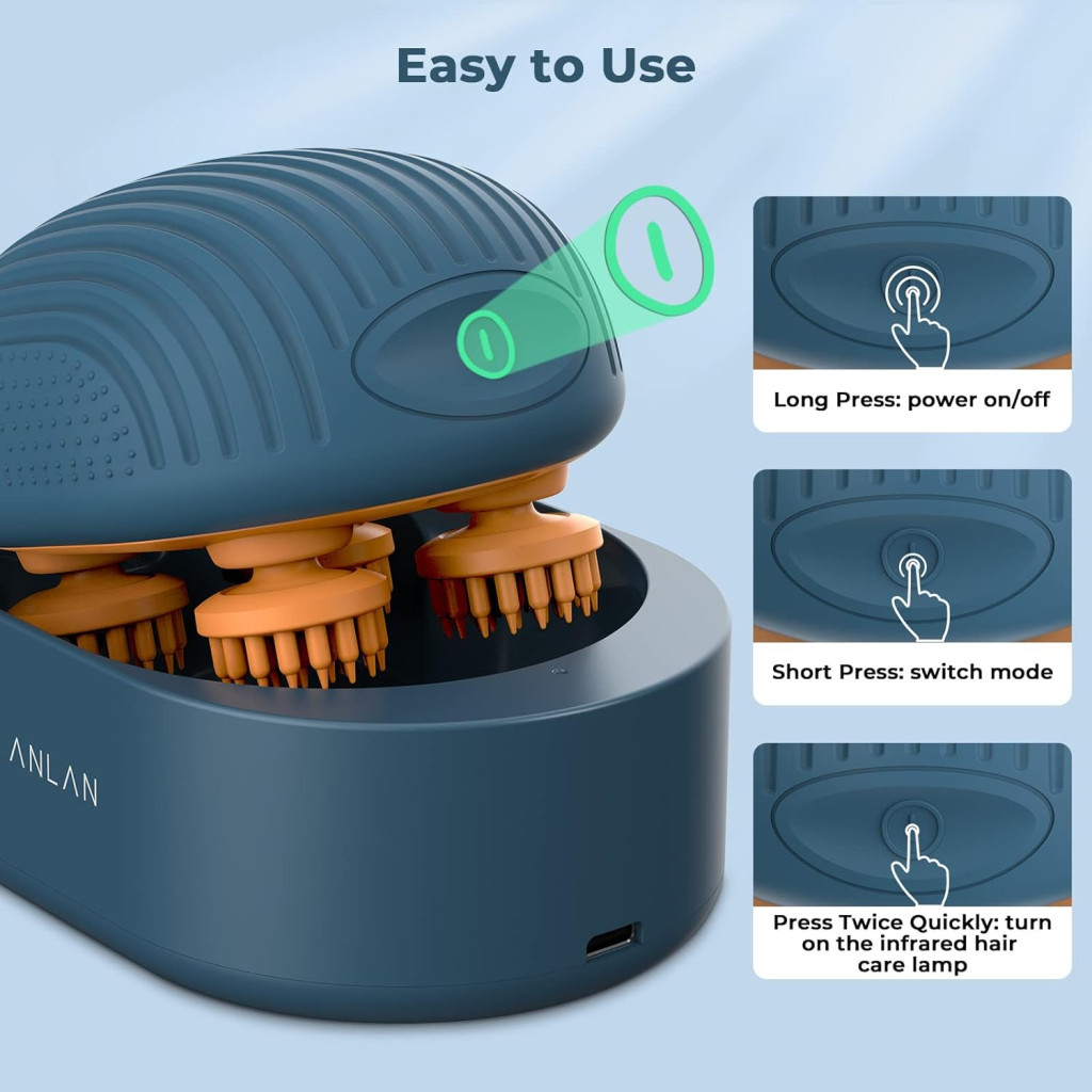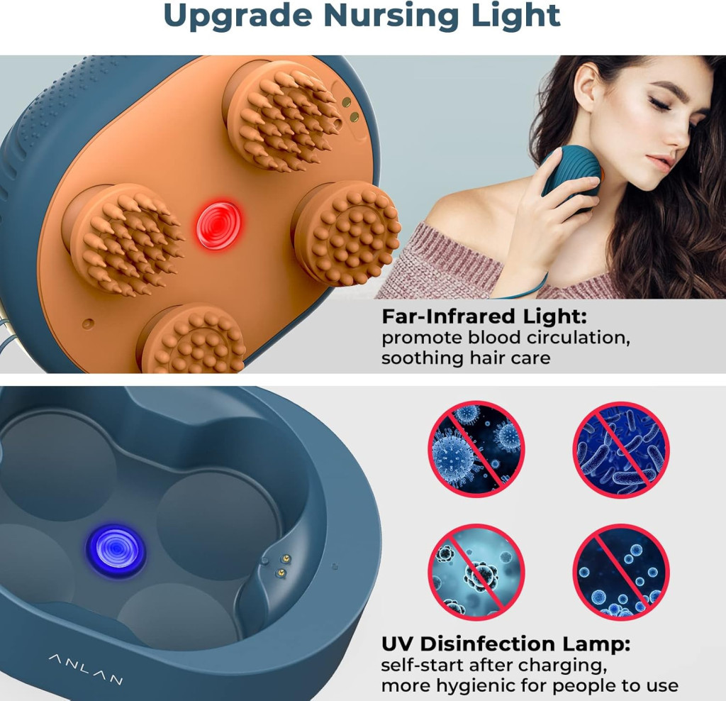 Elektrický masážní přístroj na pokožku hlavy ANLAN je vybaven dvěma jednotkami, z nichž každá má čtyři masážní hlavice, tedy celkem osm hlavic. Poskytuje tak plnohodnotný 360° masážní zážitek. Pomáhá zmírnit bolesti hlavy, snižovat stres a podporuje krevní oběh v pokožce hlavy, což může přispět ke zdravějšímu růstu vlasů. Je obzvlášť vhodný pro lidi trpící napětím, úzkostí nebo problémy se spánkem.