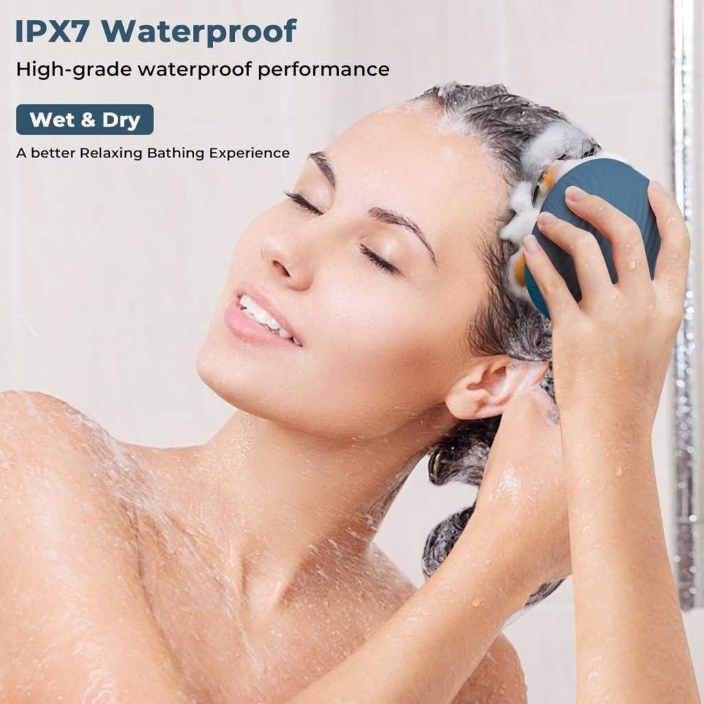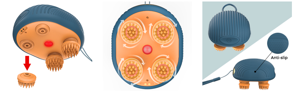 Díky vodotěsné ochraně IPX7 lze zařízení bezpečně používat i během sprchování. Odnímatelné masážní hlavice z ekologického, měkkého silikonu jemně ošetřují pokožku hlavy, nedráždí ji a snadno se čistí.