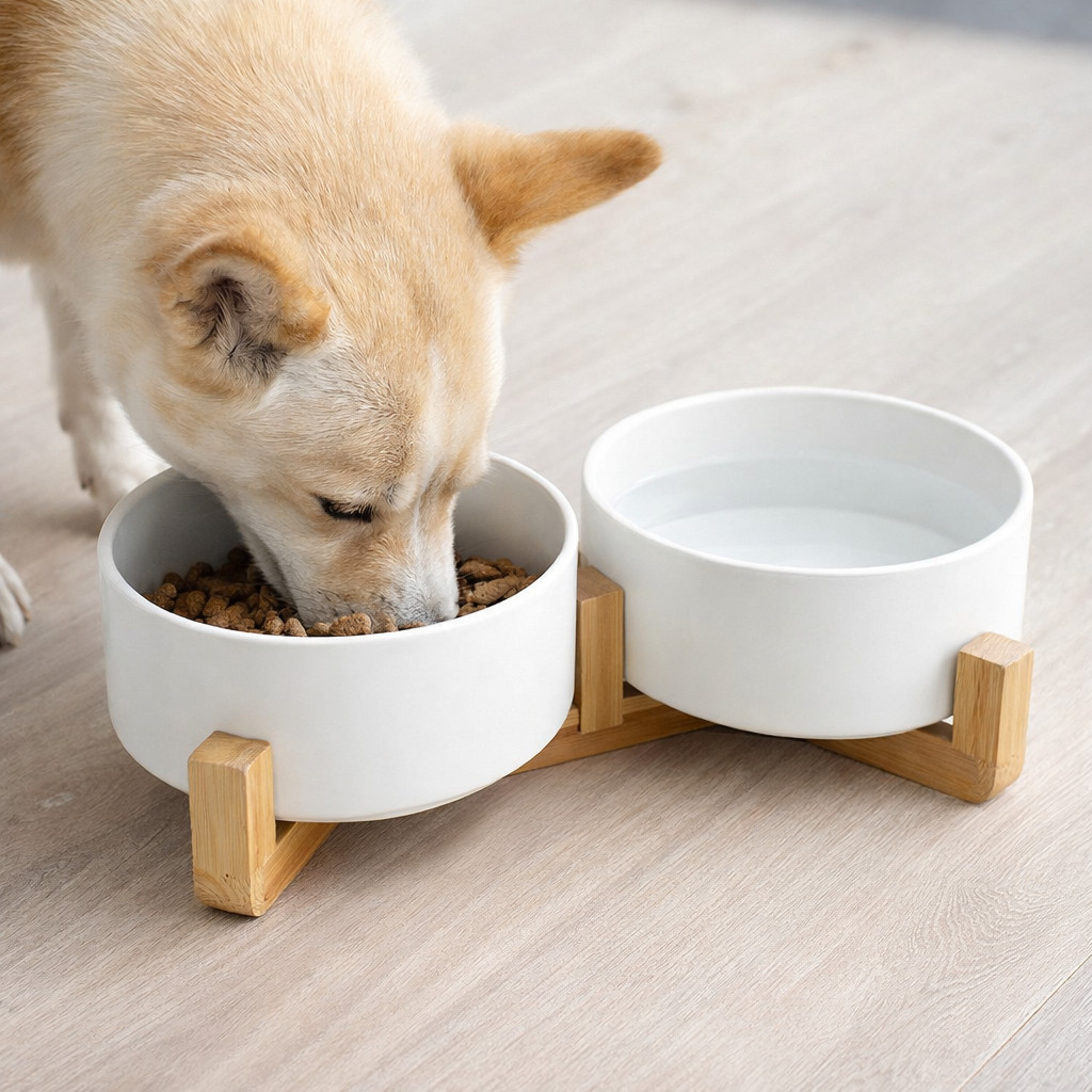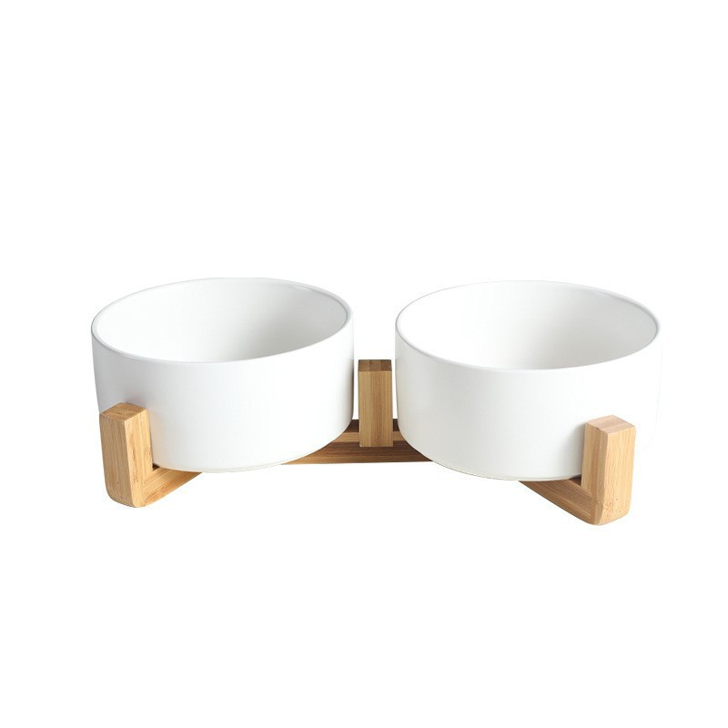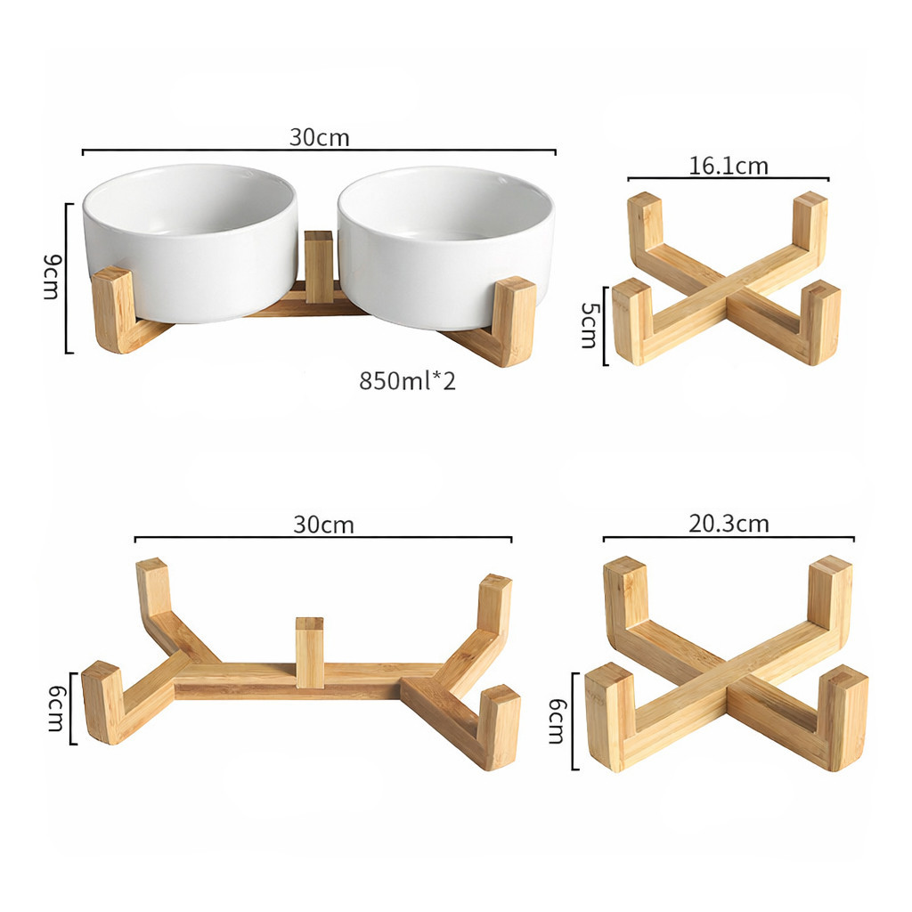 Dvojitá keramická miska pro malé zvířata s bambusovým stojanem